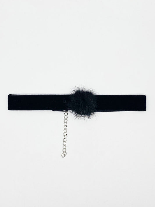 Black Faux Velvet Band Choker Necklace With Black Pom Pom