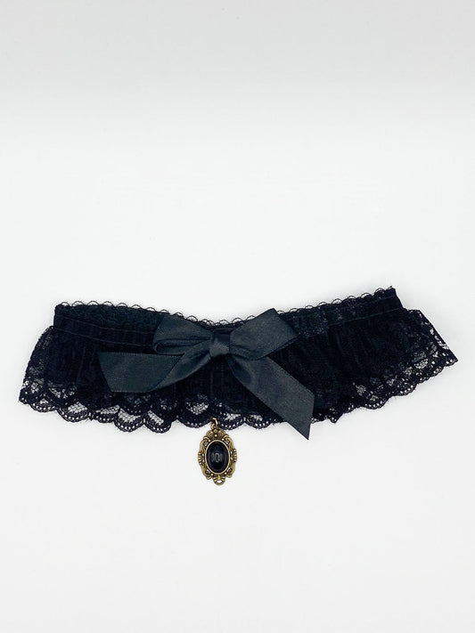 Black Gathered Lace Choker With Satin Bow And Droplet Stone