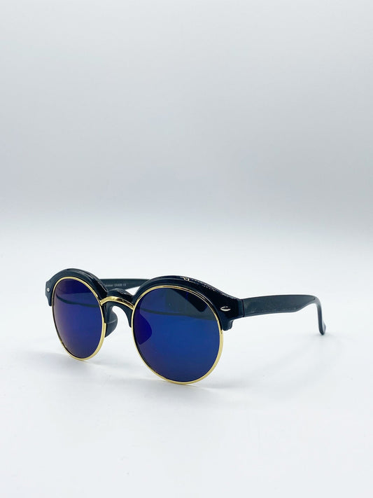 Black Round Sunglasses with Blue Revo Lenses and Gold Detail