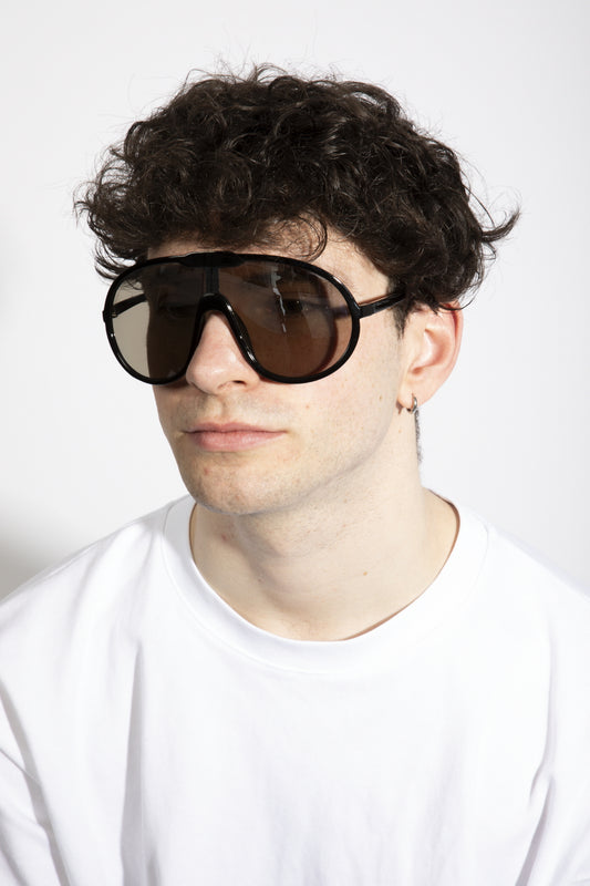 A clear shield that covers your eyes and part of your face, protecting you from the sun, wind, and dust. It fits around your face and is now a trendy choice for a sporty, futuristic style.
