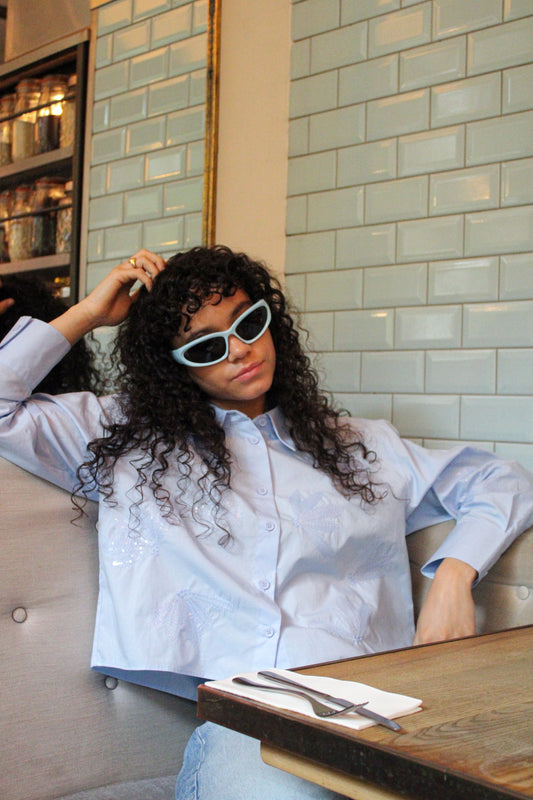 Baby Blue Racer Style Sunglasses with Black Lenses
