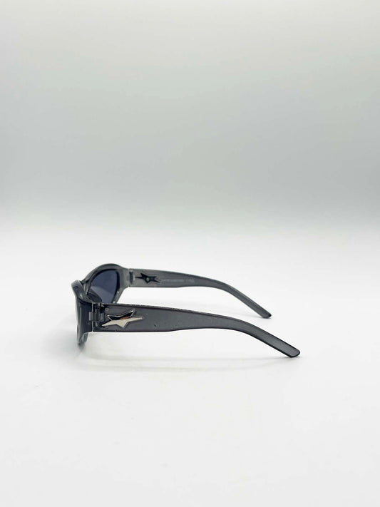 Wrap Around Racer Sunglasses with Star Hinge Detail in Black